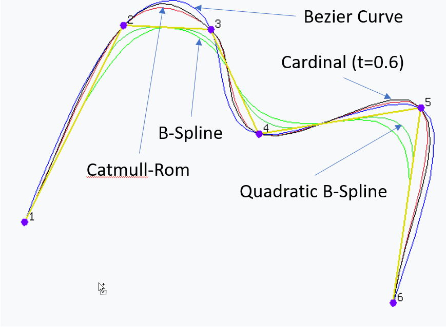 Creating curves from a set of control points is a very well-understood mathematics problem. This task is done usings splines. However, there are many types of splines, each having their own set of properties. The most popular of these various spline types include: